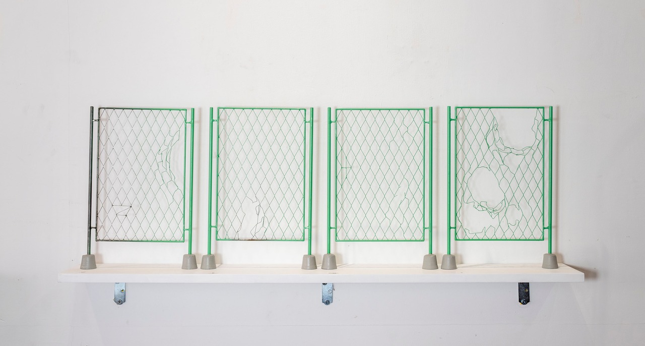 当たり前の事象を受動的に受け入れ続けることへの危機感を制作の主題としています。見えにくいものを見ようとする事と、想像を膨らませる事は似ていると感じます。見づらい作品を制作することで「目を凝らしてよく見て」もらい、当たり前のように見過ごされる違和感の再考を試みています。最近は工事や公園で使用されるフェンスを、風景画(P号)のキャンバスの比率で制作しています。フェンスは内側と外側の安全や安心を守る役割を持っています。しかし安全安心は時には退屈で、何か変化を期待してしまいます。退屈を打破する機会を、フェンス越しの景色を眺めながら常に伺っている様な気がします。