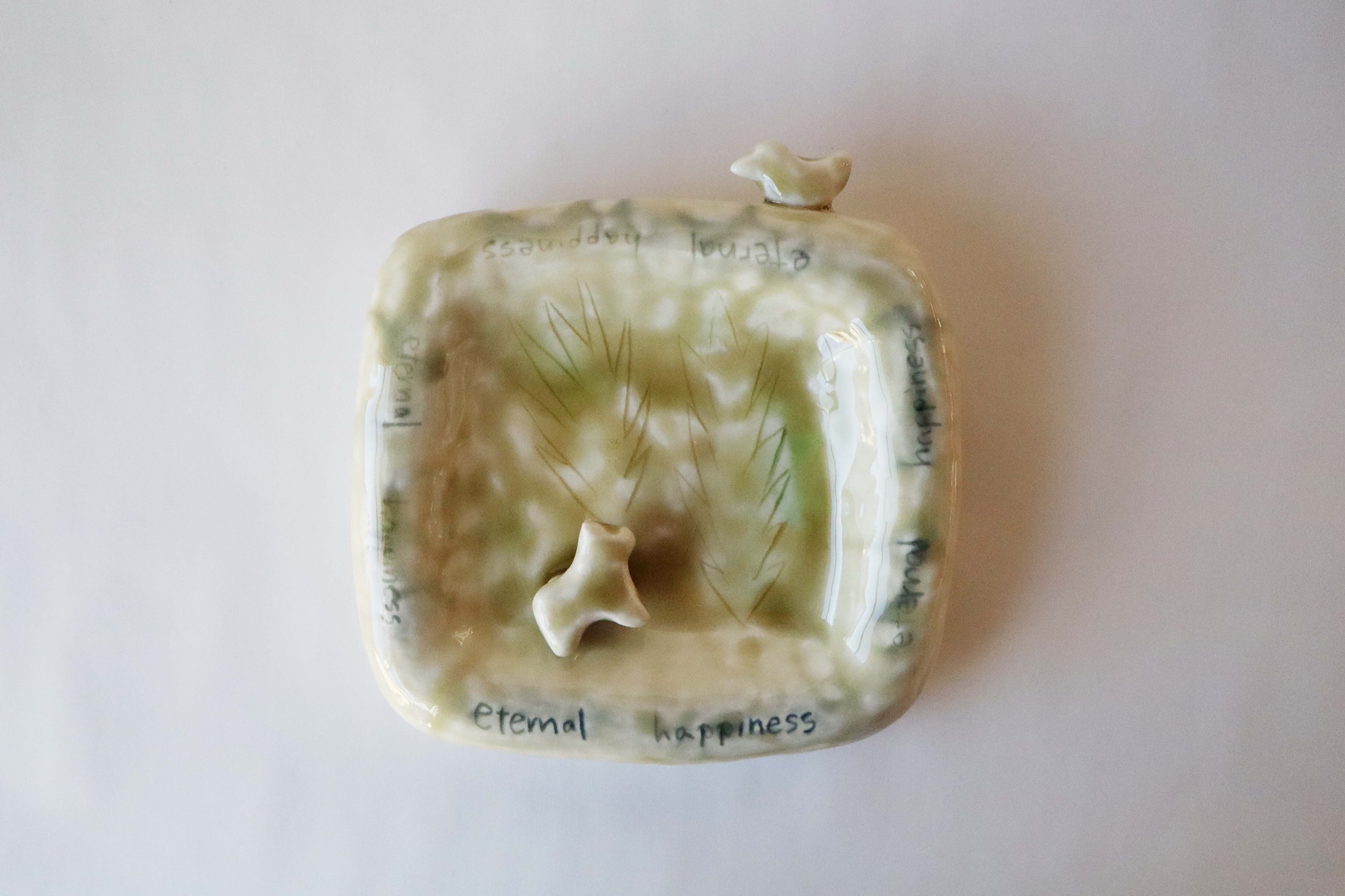 色遊びのような感覚で釉薬を扱い、その場の感覚に任せて色を重ねています。窯の中で生まれる意図しきれない色の変化や、完成したあとに気づく違和感や面白さも含めて、作品としてとどめています。